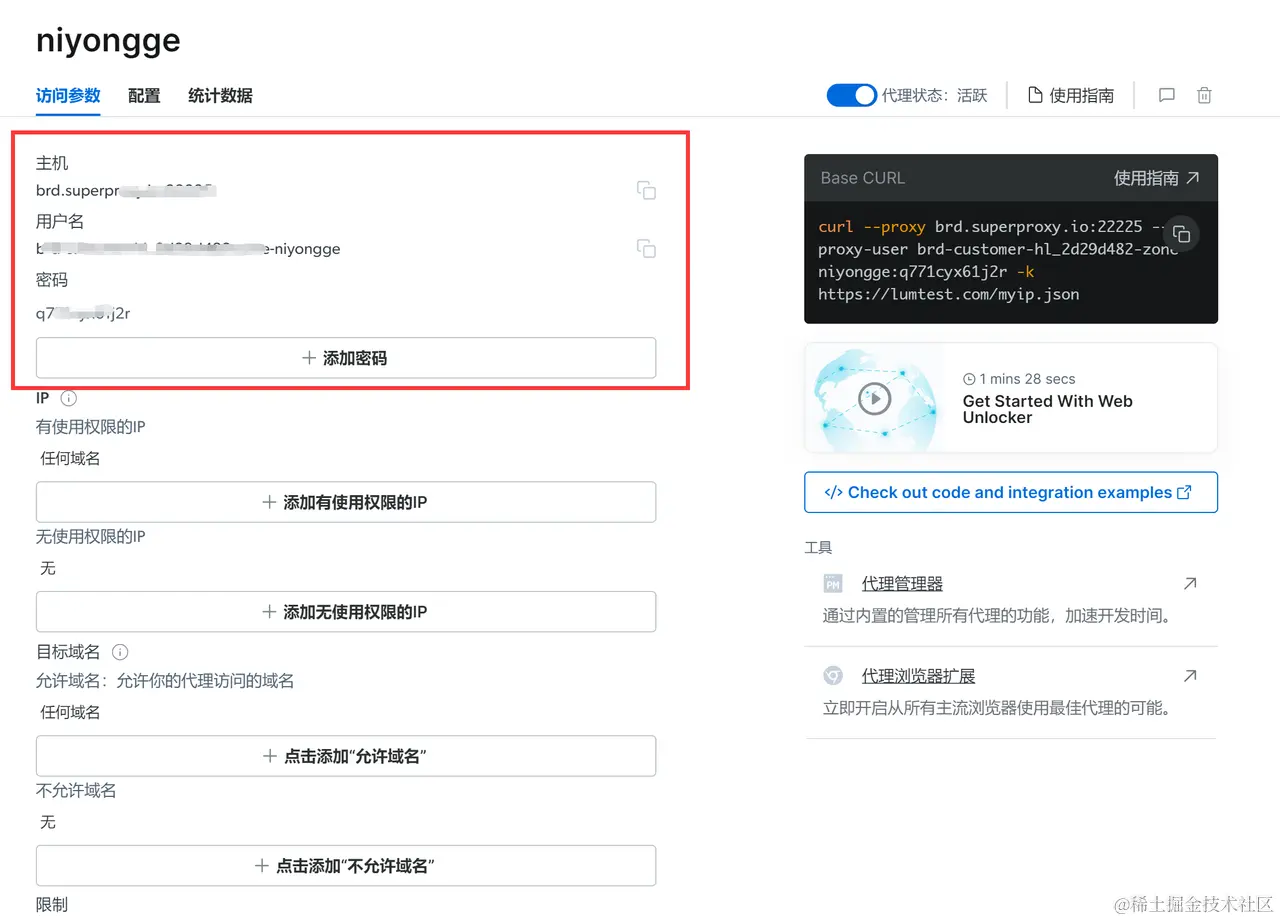直接点击【添加】后就会出现访问参数,我们一会使用【python】跑一下,在下图中也可以看到对应的蓝色英文,我们点击【Check out code and integration examples】即可进入到【代理集成示例】页面。