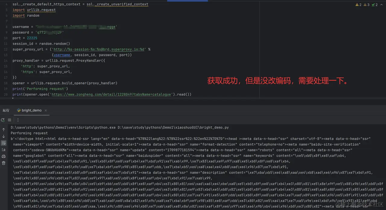 很明显的能看出是先判断了python的版本,我电脑我知道,就是python3,所以我就去掉没用的代码了,去掉后我们跑一下,看到访问成功,但是返回的信息需要改一下编码。