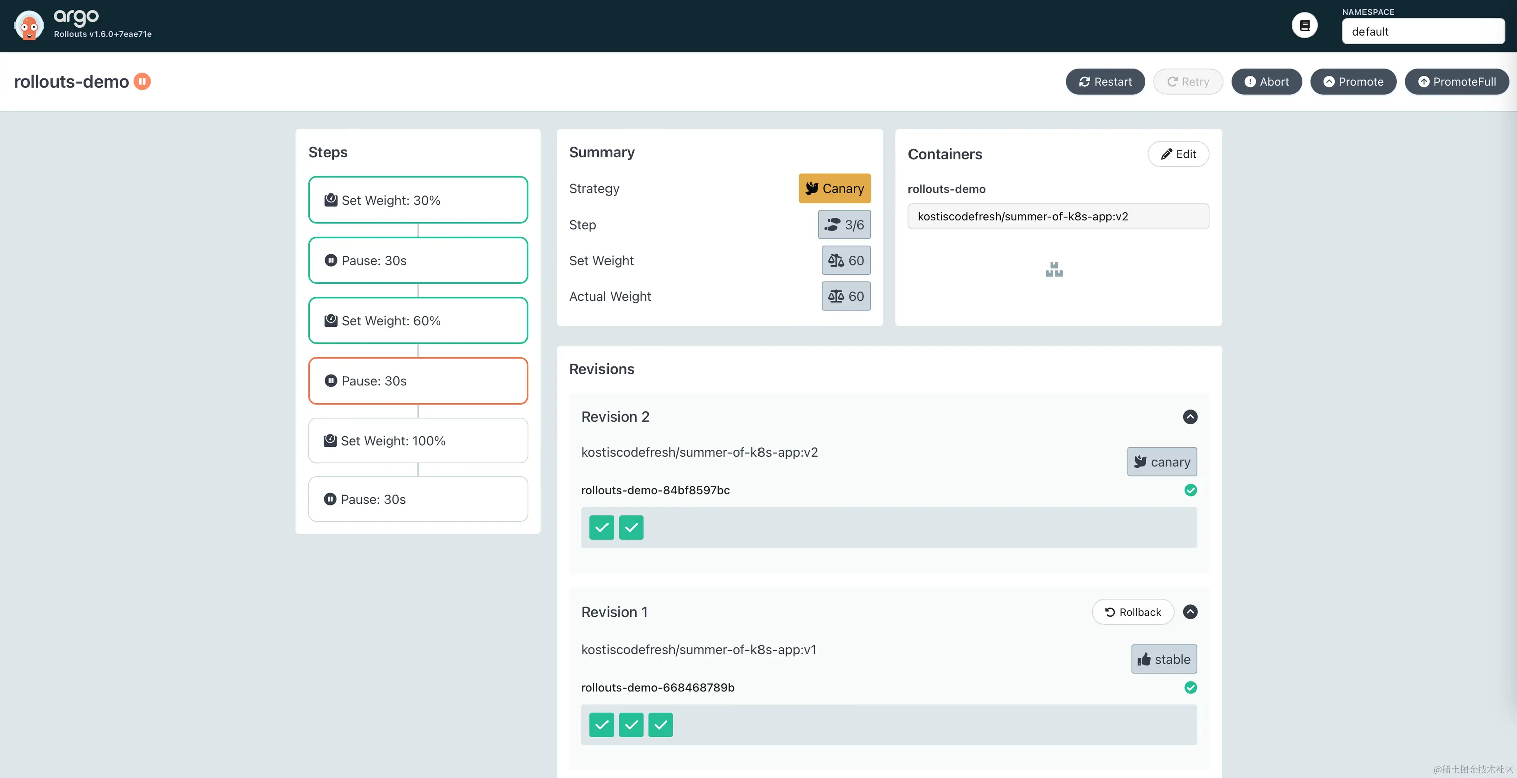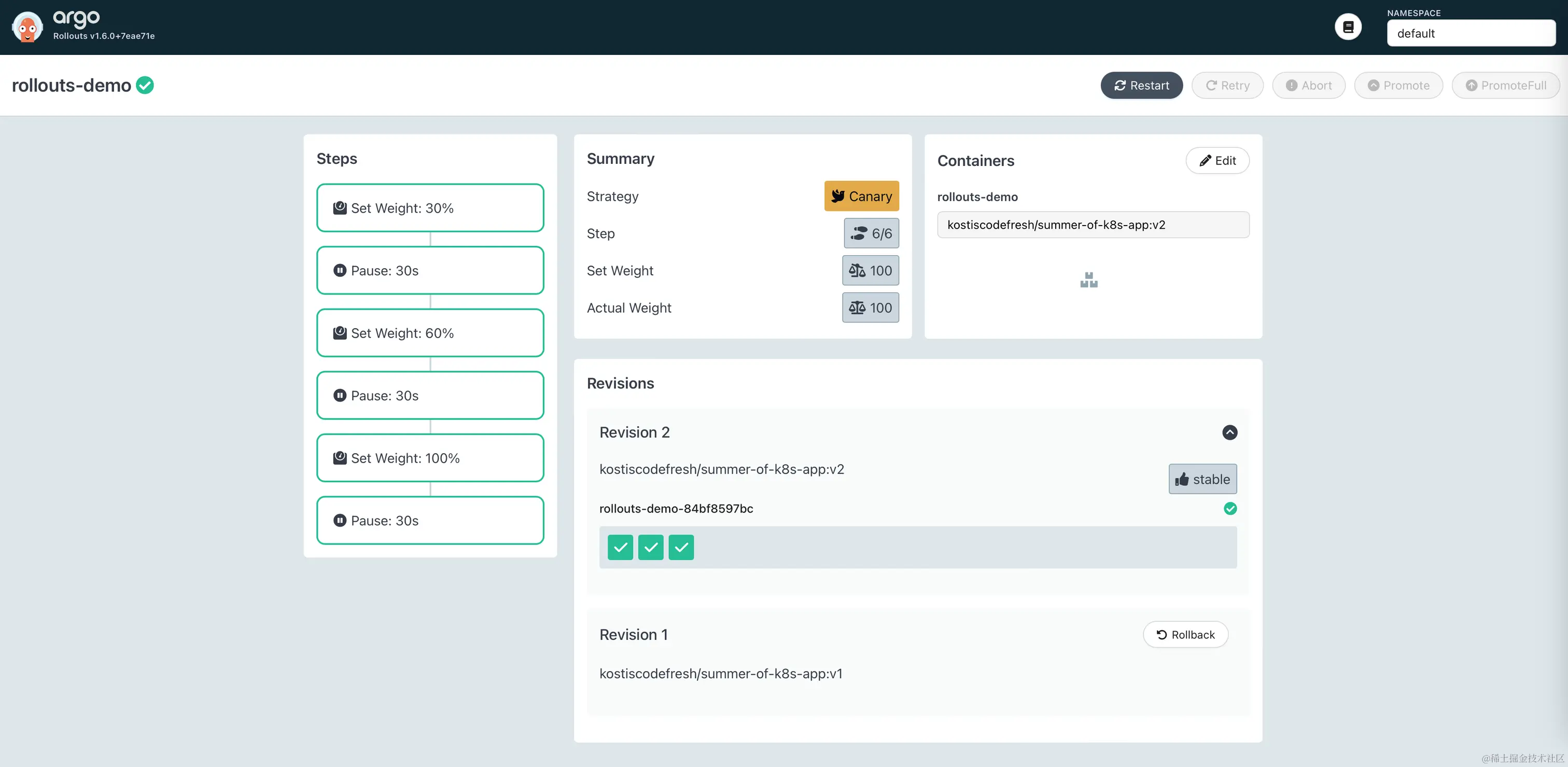 当然,在 Argo Rollouts 的 Dashboard 中我们可以更加直观地看到 Rollout 的执行流程。