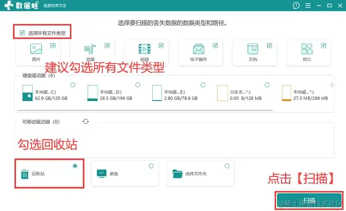 步骤2:先勾选上【回收站】后,可以对需要恢复的相关文件类型进行选择,建议勾选所有文件类型,完成后,单击 【扫描】;