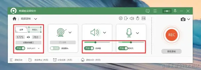 步骤2:在录制开始之前,先进行简单的设置,选择需要录制的屏幕范围,然后对声音来源(如扬声器与麦克风)进行调整。