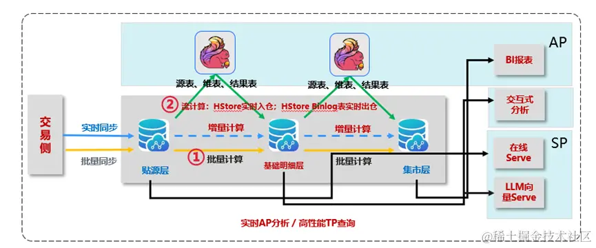 如下图,增量数据可以被流引擎实时地感知捕获到,并运行预置的增量计算任务,然后再写回到数仓的下一层模型里面。通过几次流引擎的迭代,使得贴源层的增量数据能迅速的反映到明细层以及最终的集市层,来支撑实时的BI报表分析、交互式分析等业务场景。