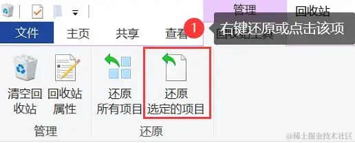 第3步:选中要恢复的文件,然后右键点击选择【还原】 选项,或者点击回收站窗口上方的【还原选定的项目】,文件将被还原到原来的位置。