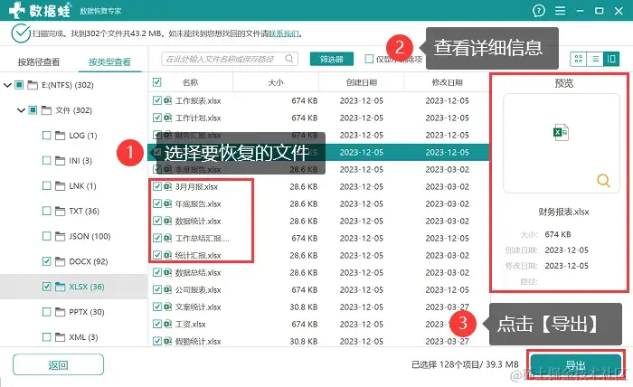 第3步:将需要恢复的文件都勾选完毕后,单击【导出】,并为导出后的文件选择一个与原扫描位置有所区别的磁盘进行保存即可。