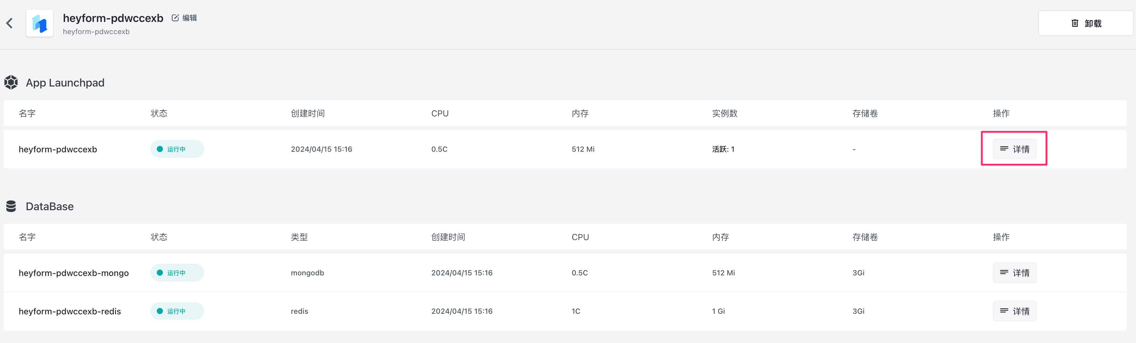 跳转进来之后,点击右上角的「部署应用」开始部署,部署完成后,直接点击应用的「详情」进入该应用的详情页面。