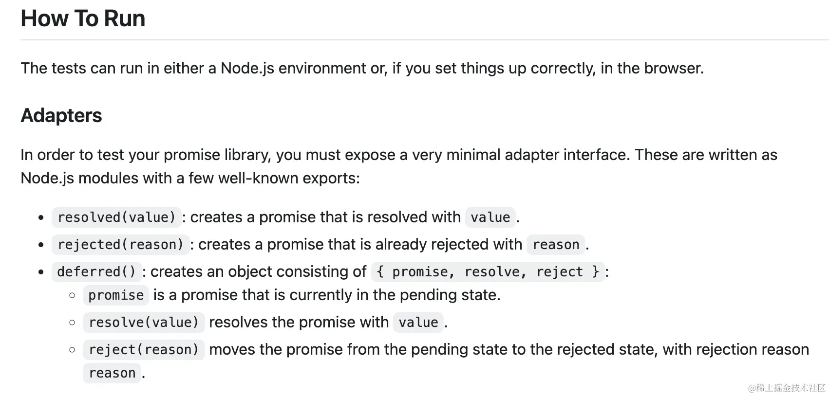 github.com/promises-ap…提供了872测试用例。要使用它来测试,需要先看下要求: