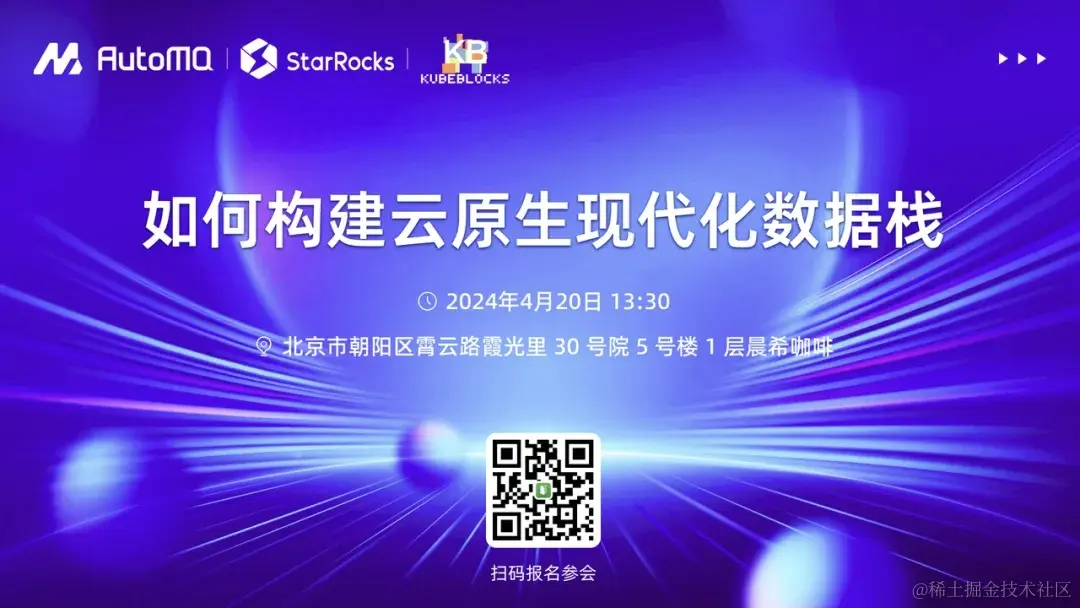 4 月 20 日,AutoMQ 联合 StarRocks 和 KubeBlocks 将在北京举办《企业如何构建云原生现代化数据栈》Meetup。会议将探讨云原生现代化数据栈在不同场景下的实际应用案例。其中,京东 Kafka 云原生架构师钟厚会分享 AutoMQ 部署在 Kubernetes 上的经验,同时,AutoMQ 首席产品经理陈仲良为大家介绍 AutoMQ 的弹性能力和适用场景。