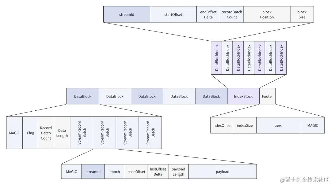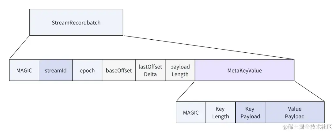 数据块 DataBlock 用来保存实际写入的数据,如果 stream 是 datastream 的载体的话 StreamRecordbatch 对应每个 Kafka 写入的 RecordBatch。如果 stream 是 MetaStream 的话,则保存的是 Kafka topic 的相关元数据的 kv 对信息。
