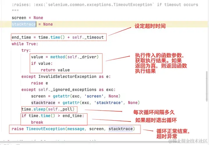 - 结束条件函数:结束条件函数是用于检查特定条件是否满足的函数。它通常使用expected_conditions模块中的方法来定义,如等待元素可见、元素可被选中等。当结束条件函数返回True时,等待结束。