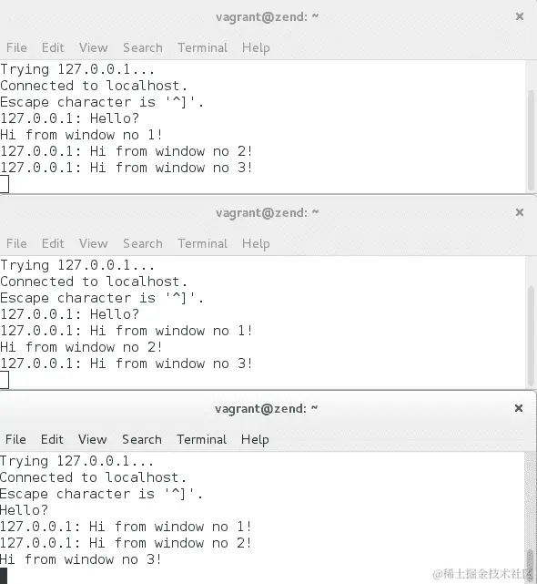 通过telnet连接后,只需在一个终端窗口和另一个终端窗口之间来回发送消息,玩得开心:
