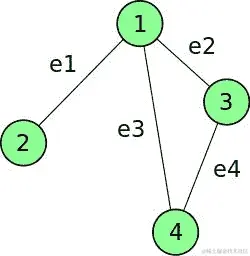 如果顶点是边的端点之一,则边与顶点相关。此外,如果两条边共享一个顶点,则两条边是相关的。如果考虑下图,我们可以看到边(e1,e2),(e2,e3)和(e1,e3)共享顶点 1。我们还有边(e3,e4)共享顶点 4,以及边(e2,e4)共享顶点 3。类似地,我们可以说顶点 1 与边 e1,e2 和 e3 相关,顶点 2 与边 e1 相关,顶点 3 与边 e2 和 e4 相关,顶点 4 与边 e3 和 e4 相关: