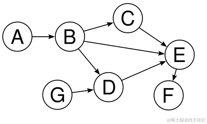 如果图只包含有向边,则图称为有向图。有向图也称为有向图或有向网络。下图表示了一个有向图。这里,(A,B),(B,C),(C,E),(E,D),(E,F)和(D,B)边是有向边。由于边是有向的,边 AB 与边 BA 不同: