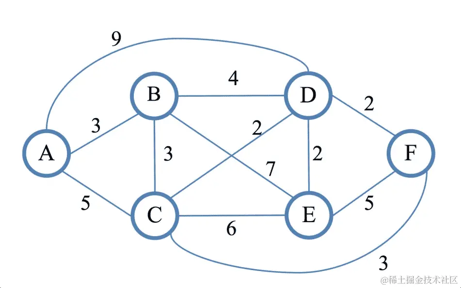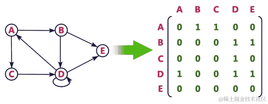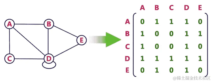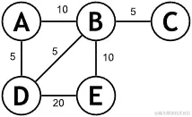 图中的每个节点称为一个顶点。通常,顶点表示为一个圆。在我们的图中,节点 A,B,C,D 和 E 是顶点。