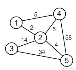 如果图的所有边都是加权边,则图称为加权图。我们将在接下来的部分中详细讨论加权图。加权图可以是有向图或无向图。每条边必须有一个与之关联的值。边的权重总是被称为边的成本。下图表示了一个具有五个顶点和七条边的无向加权图。这里,顶点 1 和 2 之间的边的权重为 2,顶点 1 和 4 之间的边的权重为 5,顶点 4 和 5 之间的边的权重为 58: