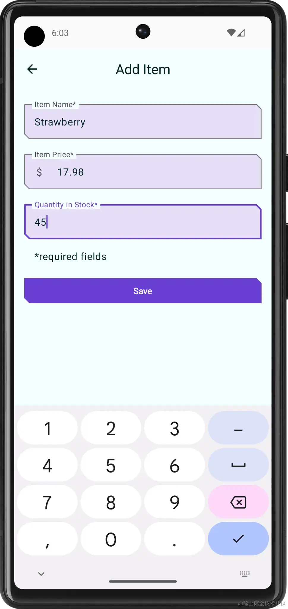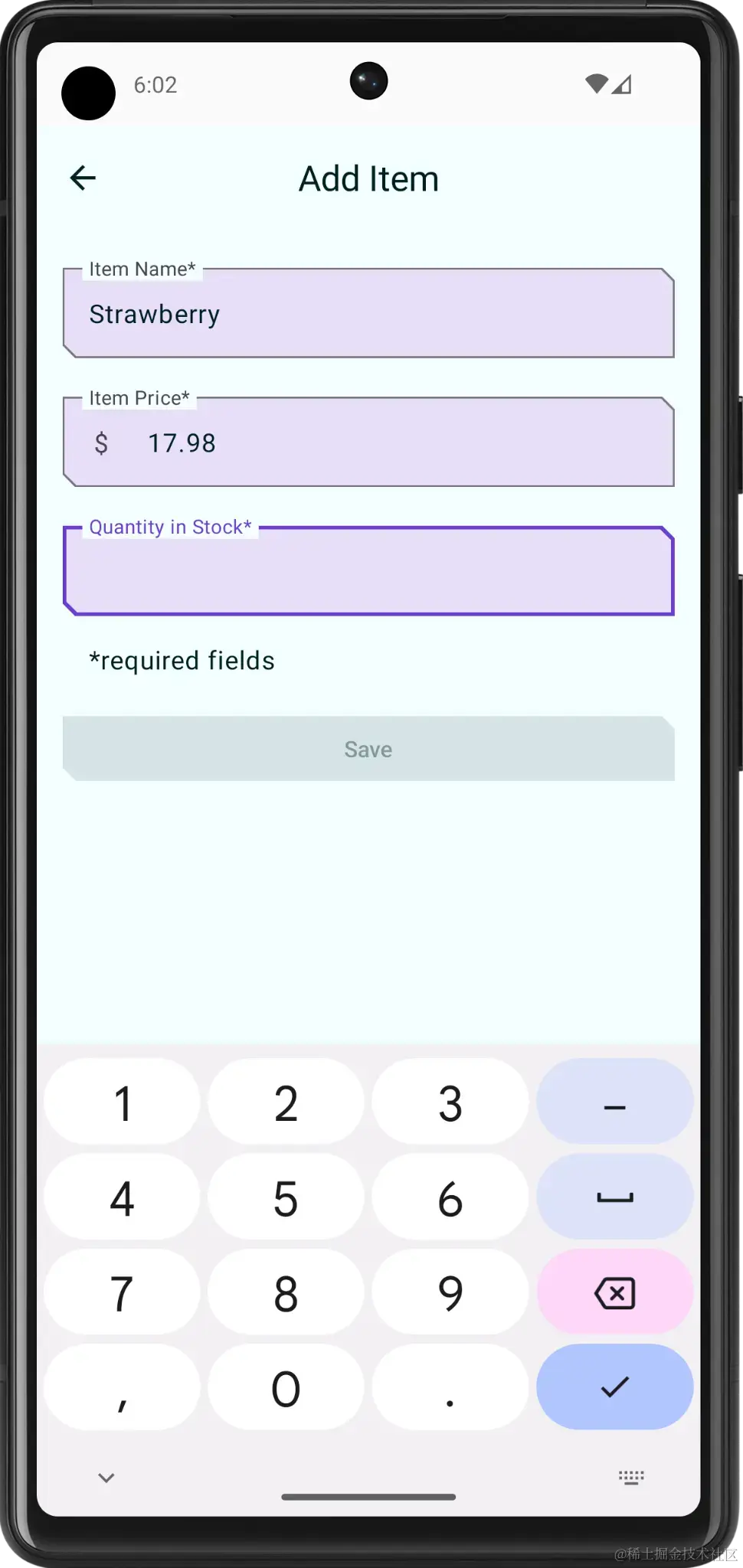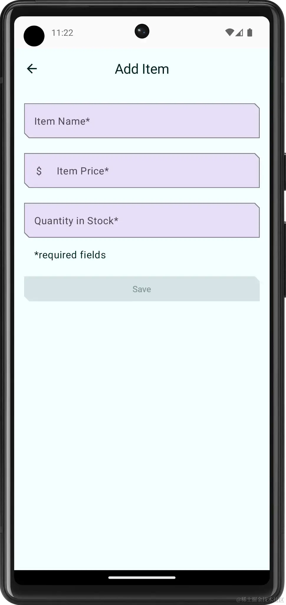 ItemInputForm()可组合函数实现,并注意onValueChange函数参数。使用用户在文本字段中输入的值更新itemDetails值。启用 Save 按钮后,itemUiState.itemDetails便具有需要保存的值。