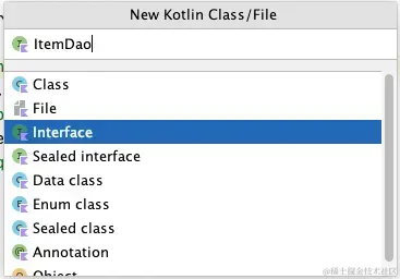 data软件包内,新建ItemKotlin 类,该类表示应用中的数据库实体。