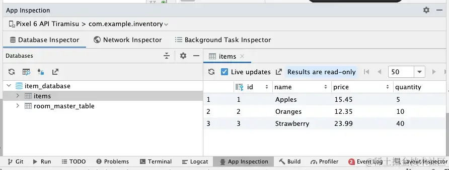 com.example.inventory(如果尚未选择)。Inventory 应用中的 item_database 将显示于 Databases 窗格中。