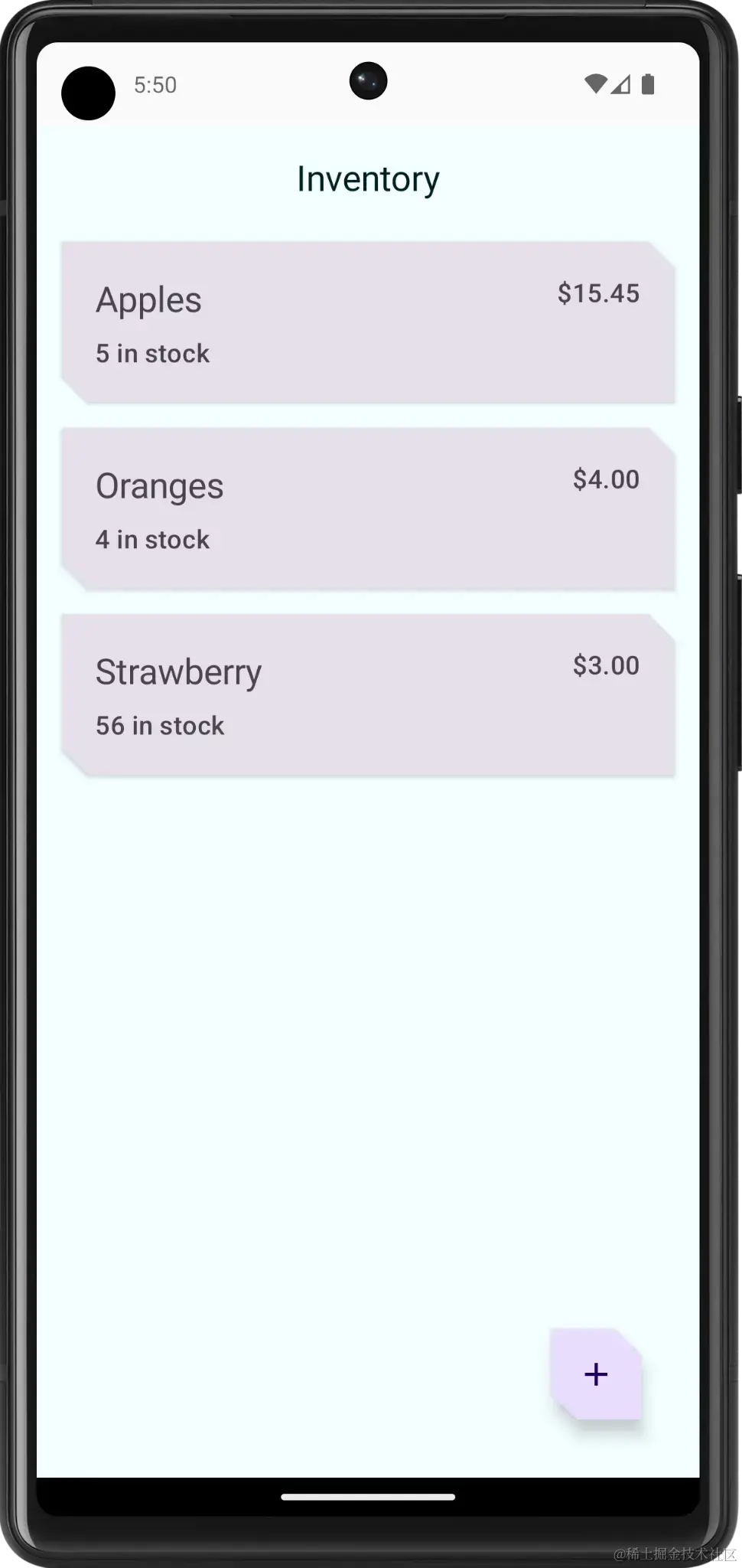 在此 演示应用中,将使用 Inventory 应用的起始代码,并使用 Room 库向其中添加数据库层。最终版本的应用会显示商品目录数据库中的商品列表。用户可以选择在商品目录数据库中添加新商品、更新现有商品和删除其中的商品。在此 演示中,需要将商品数据保存到 Room 数据库。