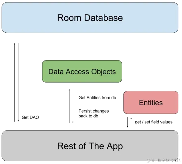 下图演示了 Room 的各组件如何协同工作以与数据库交互。