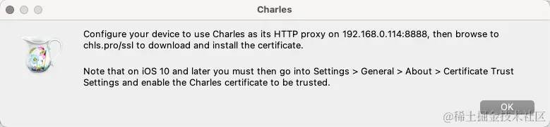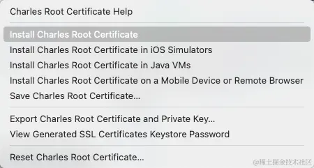 Help -> Install Charles Root Certificate on a Mobile Device or remote Browser,点击之后系统会有一个弹窗,点击确定