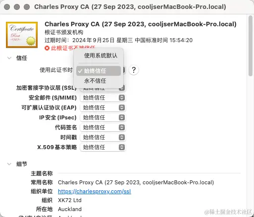 点击菜单 Help -> SSL Proxying -> Install Charles Root Certificate 菜单,点击后会跳转到系统的钥匙串并添加一个证书,此时证书还属于不可信的状态。