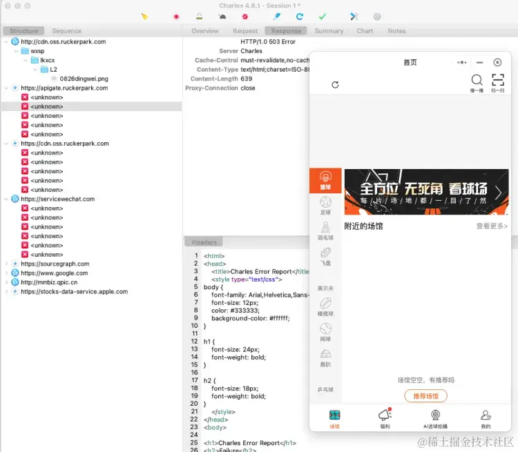 为了便于贴图,这里我要抓取的目标小程序就暂定成洛克公园吧,为啥是它?因为最近刚去打过球,它显示在列表前几位而已。我们这时尝试去抓取 PC 微信小程序的包,会发现 https 的请求显示都是 unkonwn,这是因为证书校验未通过,所以我们要安装 charles 的根证书。