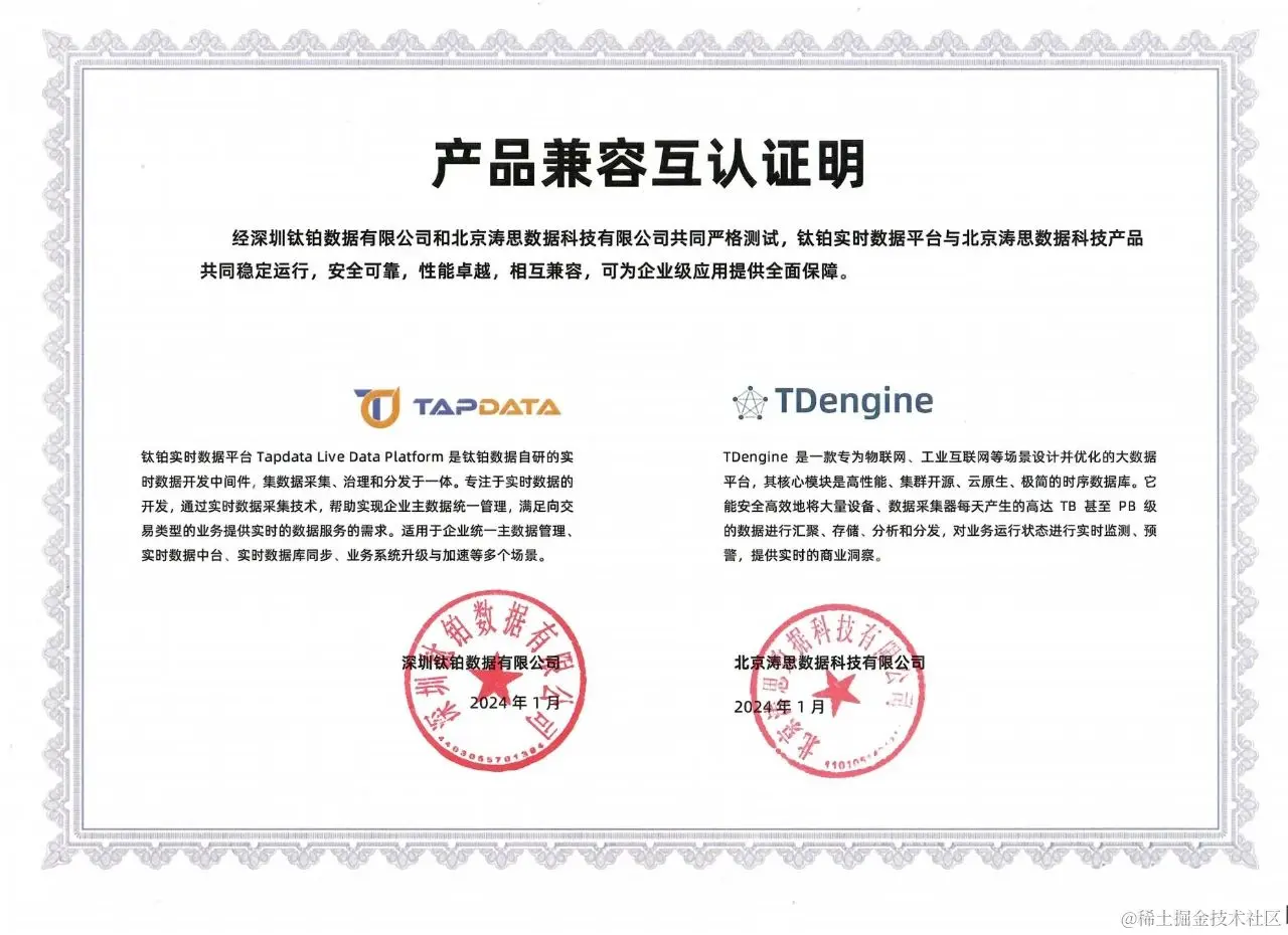 近月,深圳钛铂数据有限公司(以下简称钛铂数据)自主研发的**实时数据平台(Tapdata Live Data Platform)**与北京涛思数据科技有限公司(以下简称涛思数据)自主研发的大数据平台 TDengine,已经完成了产品兼容性互认证。