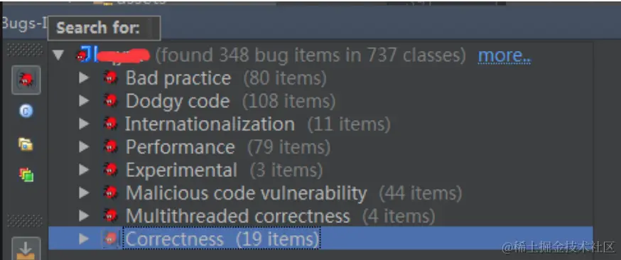 Findbugs的检测器已增至300多条,被分为不同的类型,常见的类型如下: