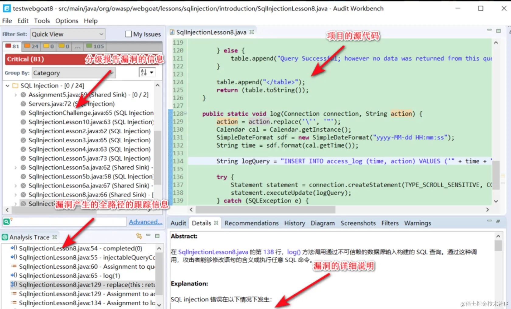 - 数据流分析:它不仅分析单个代码文件,还跟踪应用程序的数据流。这有助于找到更复杂的漏洞,如未经验证的用户输入在应用程序中的传播路径。