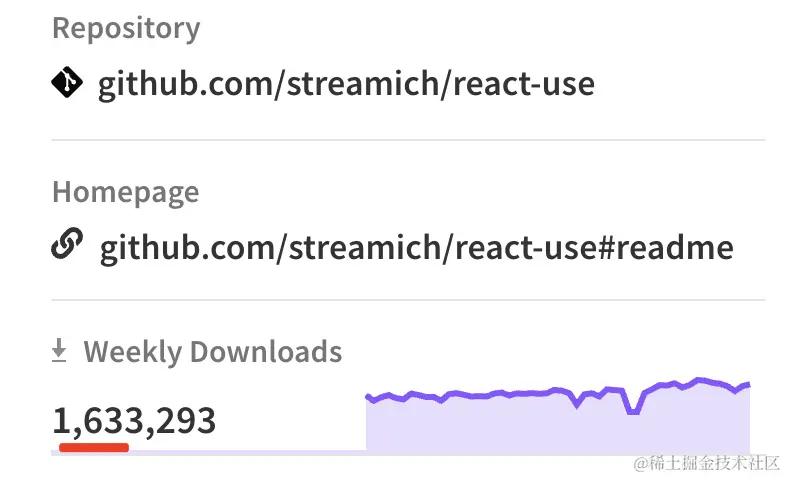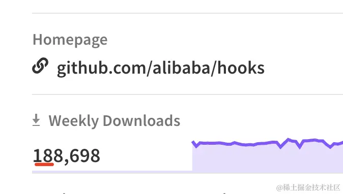 react-use 是非常流行的通用 hook 库,下载量是 ahooks 的十倍: