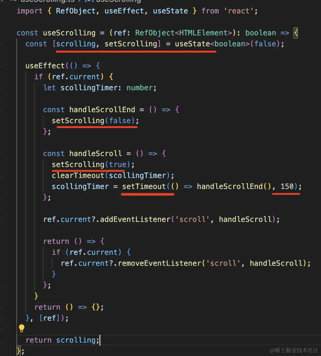 然后来封装 useScrolling 的 hook,它可以拿到元素是否在滚动的状态: