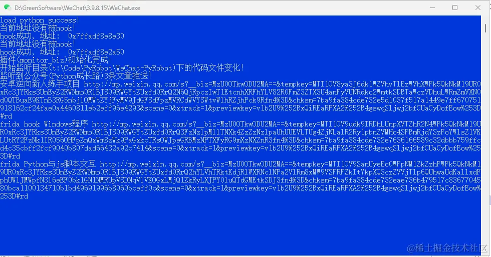 启动并登录微信,执行这个main.py就会把Python注入到微信并且打开控制台。只要收到公众号的文章推送,控制台就会打印出来