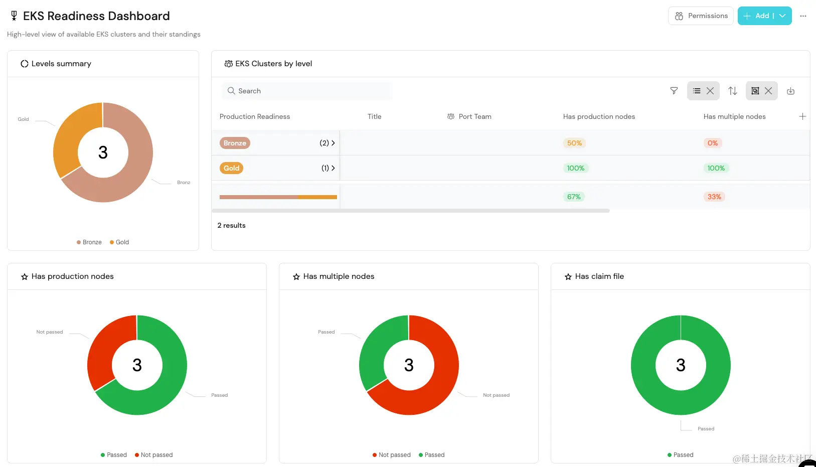 为了更进一步,我还配置了 EKS 集群蓝图上的几个记分卡。这使我能够创建一个 EKS 就绪仪表板,向我展示我的所有集群以及它们如何根据组织配置的标准执行。在此示例中,两个集群处于青铜标准,一个处于白银标准,因此我可以看出哪些集群正在失败以及集群出了什么问题,并且我可以了解如何提高它们的排名以确保它们全部达到标准并做好生产准备。