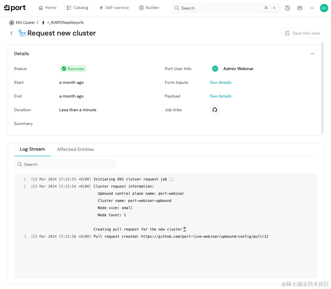 一旦工程师填写完表单,他们就可以单击执行,Port 将创建一个新的自助服务操作。此自助服务操作将启动 GitHub 工作流,该工作流将为新集群打开一个拉取请求。