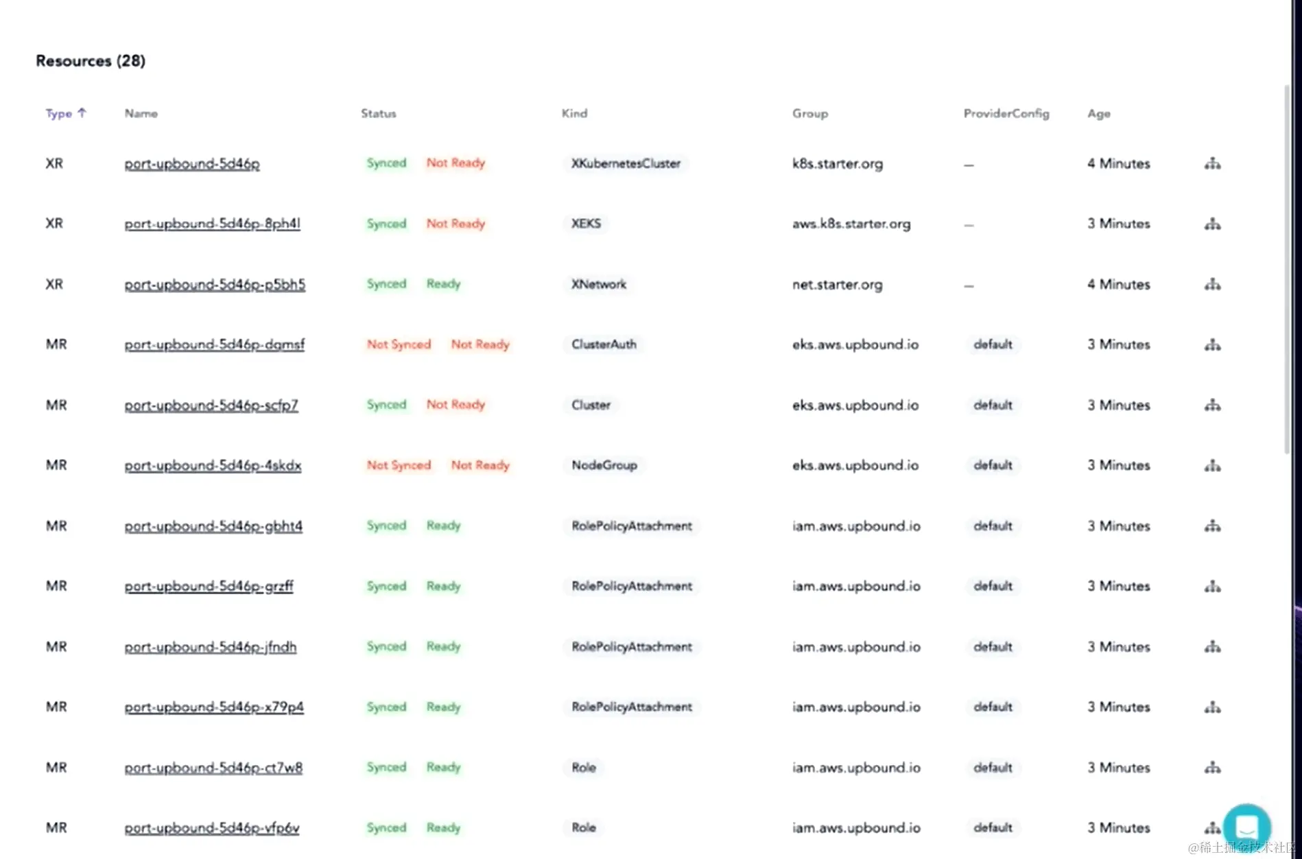 现在,如果我们查看之前的集群,我们已经可以看到一些资源开始达到就绪状态,这意味着我们将在几分钟内拥有一个新集群。一旦开发人员得知他们的请求已获批准,他们就知道在 10 到 15 分钟内他们将拥有一个正在运行的集群,并且能够开始处理他们的新功能。