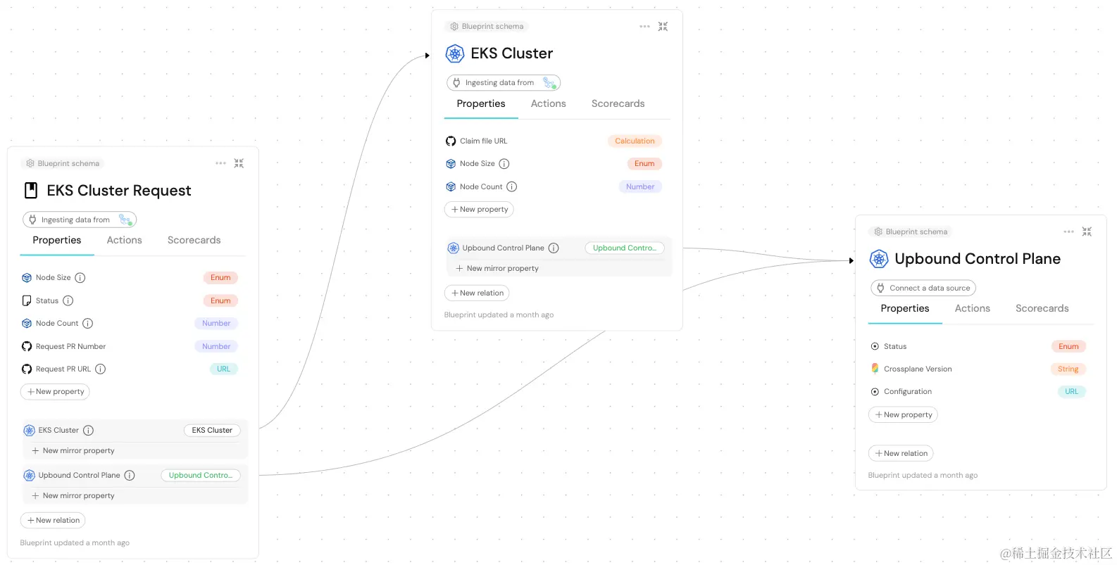 您可以在上面看到三个蓝图。蓝图是一个完全可配置的数据对象,一个模式,您可以对其进行建模以适合您想要表示的资产。因此,这里有三个蓝图:Upbound 控制平面、Amazon Elastic Kubernetes Service (EKS) 集群和 EKS 集群请求。