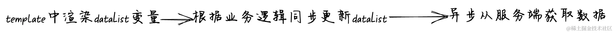 dataList在template中渲染,然后同步更新dataList,最后异步从服务端异步获取dataList,整个过程能够被穿成一条线。此时新来一位同学要去迭代dataList相关的业务,那么他只需要搞清楚产品的最新需求是应该在同步阶段去修改代码还是异步阶段去修改代码,然后在对应的阶段去加上对应的最新代码即可。