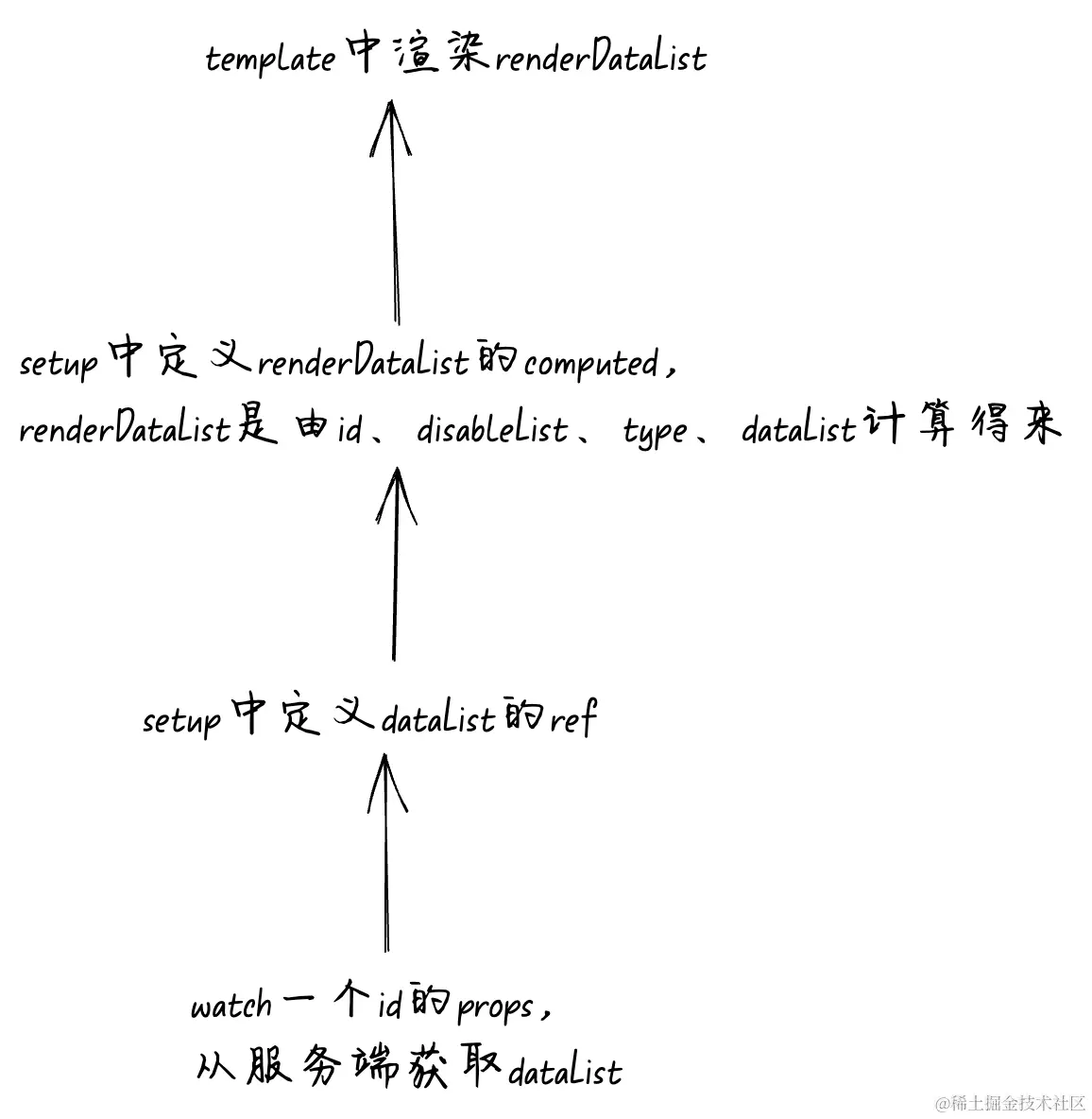 在我们上面的这个例子dataList的来源就是发散的,有很多个来源。首先是watch了props.id从服务端异步获取。然后是watch了props.disableList和props.type,同步更新了dataList。这个时候一个不熟悉业务的同学接到产品需求要更新dataList的取值逻辑,他需要先熟悉dataList多个来源的取值逻辑,熟悉完逻辑后再分析我到底应该是在哪个watch上面去修改业务逻辑完成产品需求。