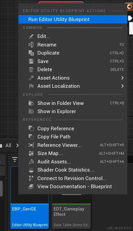 右键创建的EBP_GenGE,在最上面可以看到RunEditorUtilityBlueprint,点击以后会调用run函数