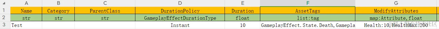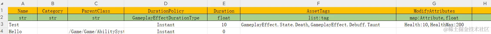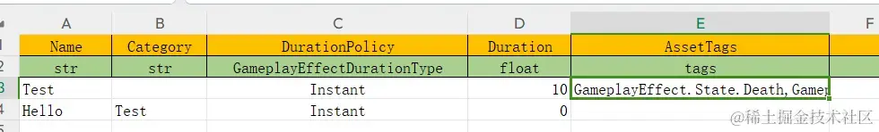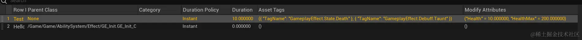 直接展示一下最后的成果,依据表中数据,创建了对应的GE_Test类Asset,并依据表中数据更新了类的属性,包括AssetTags,Duration和Modifiers等