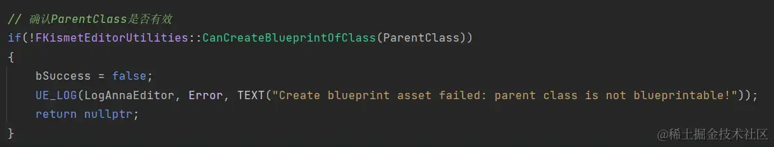- 调用KismetEditorUtilities函数库中的函数CanCreateBlueprintOfClass,判断是否可以基于输入的ParentClass生成蓝图类,判断的条件包括:Class是否有效、Class是否可以派生蓝图类等
