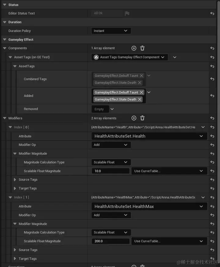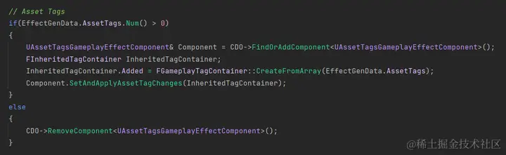 - 给GE类添加对应的AssetTags,从5.3开始,GE的属性开始由GEComponent来决定,所以如果要给GE添加Asset Tags,首先需要添加对应的AssetTagsGameplayEffectComponent。其它类似GrantAbility,Imunity等功能,也需要通过添加GEComponent去实现