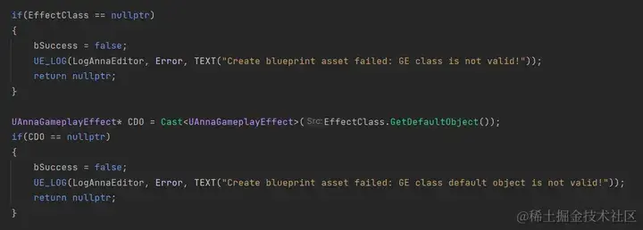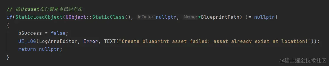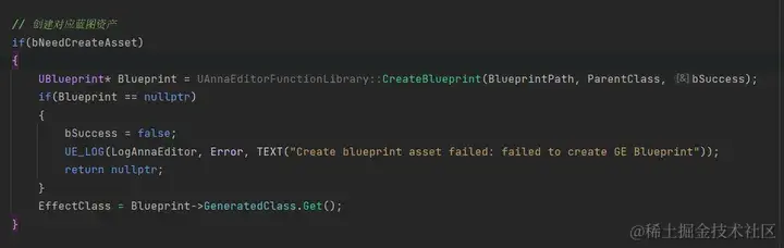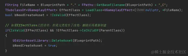 - 实现如下,第一步判断BlueprintPath的位置是否已经存在GE类,如果不存在,则需要调用上一步实现的CreateBlueprint函数生成蓝图资产