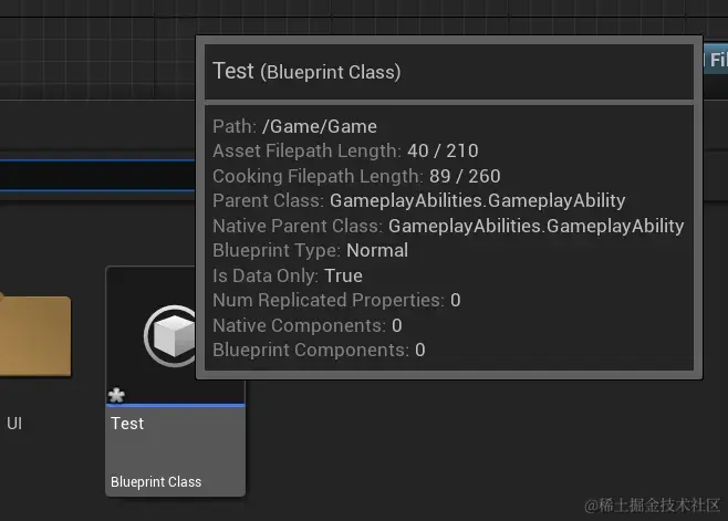 点击以后,就可以看到编辑器在指定的位置创建了GameplayAbility的类,命名为Test的蓝图资产,创建成功!