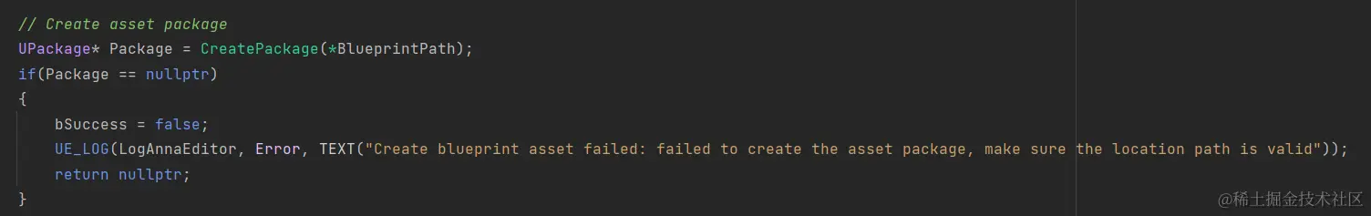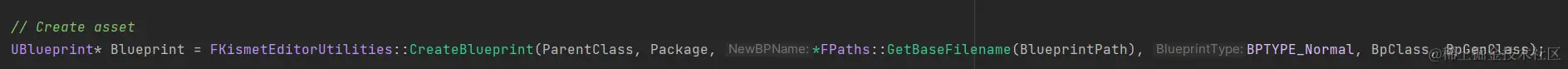 然后创建函数CreateBlueprint,功能是在指定的位置创建指定类的派生类uasset,函数的核心代码是调用引擎代码FKismetEditorUtilities::CreateBlueprint,作用是创建Blueprint类