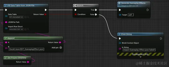 最后重新打开编辑器的EBP蓝图,在run后调用函数FillDataTableFromJsonFile,它的作用是导入json文件填充DT。填充完数据以后就可以调用生成蓝图GE的代码,至此,神功大成!
