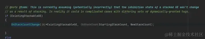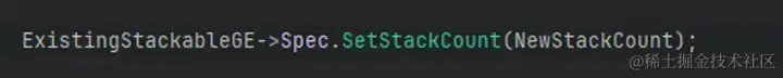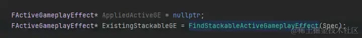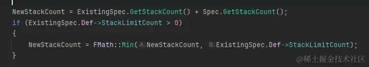 接下来需要解决的问题是,GE的堆叠是如何实现的。首先还是回到一切的起点,查看函数FActiveGameplayEffectsContainer::ApplyGameplayEffectSpec ,在一开始根据Spec找到堆叠GE已经存在的ExistingStackableGE,找的方法大致是遍历Container中所有的ActiveGE,条件为:Def和输入的Effect相同,且StackingTypr不等于None,Duration不等于instant等,找到后将ActiveEffect返回