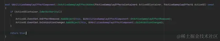 这两个问题是相互关联的,当ActiveEffectContainer创建GE时,会调用函数InternalOnActiveGameplayEffectAdded ,在这里激活GE让其生效,这边函数实际意思为,关闭AcitiveGE,输入为true关闭GE,false激活GE,方便理解我就直接把这里的行为称作激活了GE。