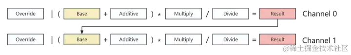 在多个Channel的情况下,会将上一个Channel的实际属性计算的最终结果result,作为下一个Channel的实际属性计算的输入,直到所有的Channel都计算完毕,最终输出的result为属性当前的current value。