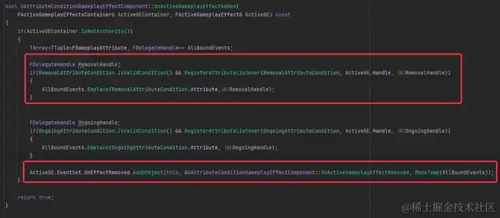 这里要做的是两件事,第一件是调用前面实现的RegisterAttributeListener,监听指定属性的变化,然后将对应的属性和委托存在AllBoundEvents中,因为Gameplay Effect Component并没有被实例化,所以里面并不能存储数据,我们需要将数据通过绑定OnEffectRemove的回调,触发OnActiveGameplayEffectRemoved函数,并将AllBoundEvents数据传进去。